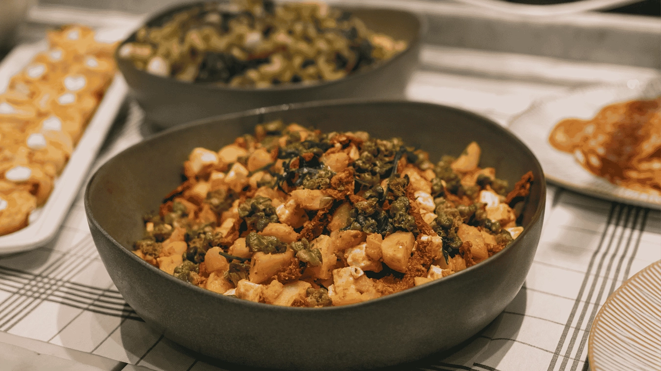 Brunchen serveras varje söndag mellan 11.00 och 14.00. Här blandas klassiska rätter med italienska favoriter – från nygräddad focaccia och charkuterier till små räkmackor och söta avslut.